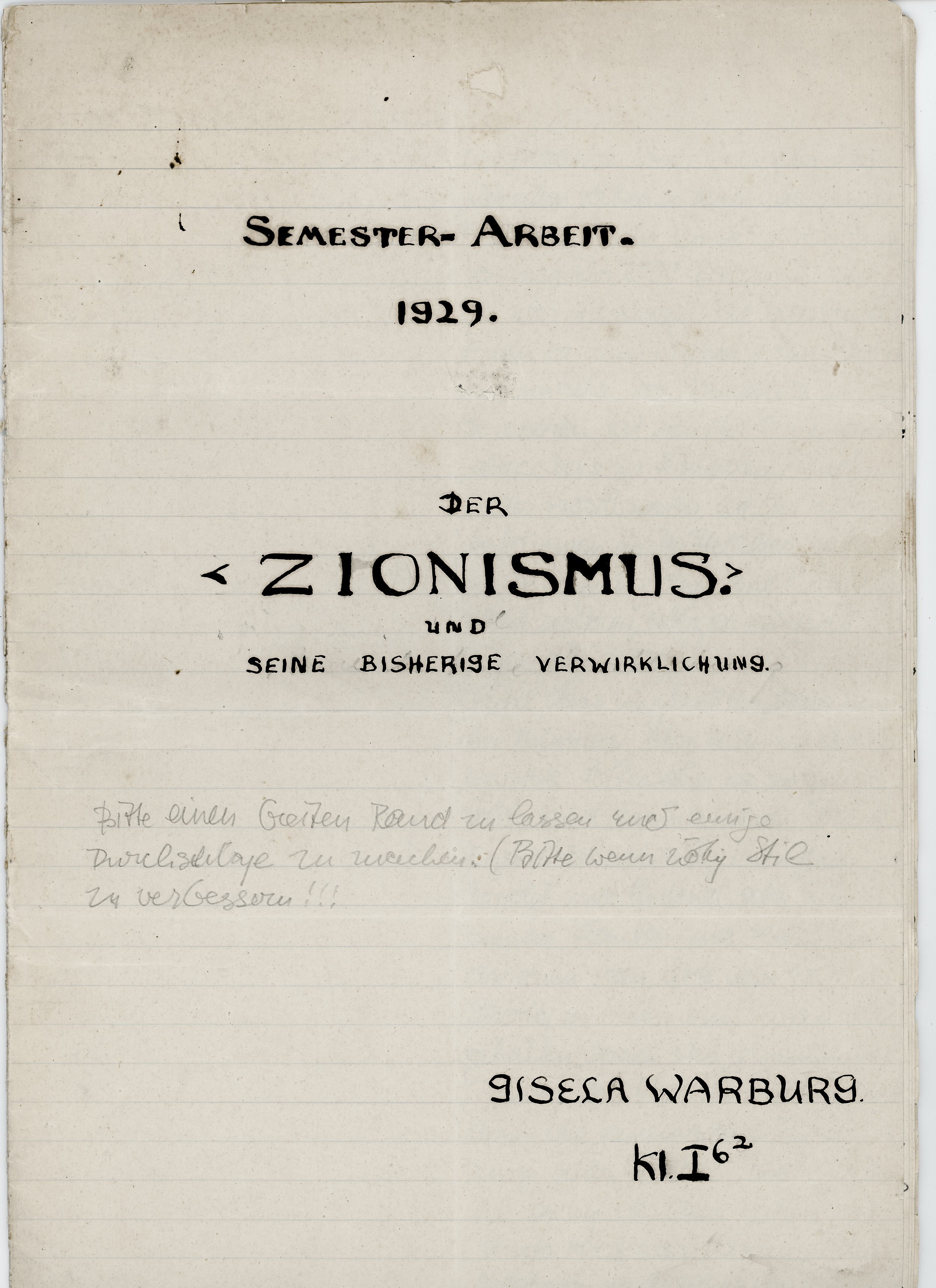 The cover page of Gisela’s 1929 thesis, “Der Zionismus.”