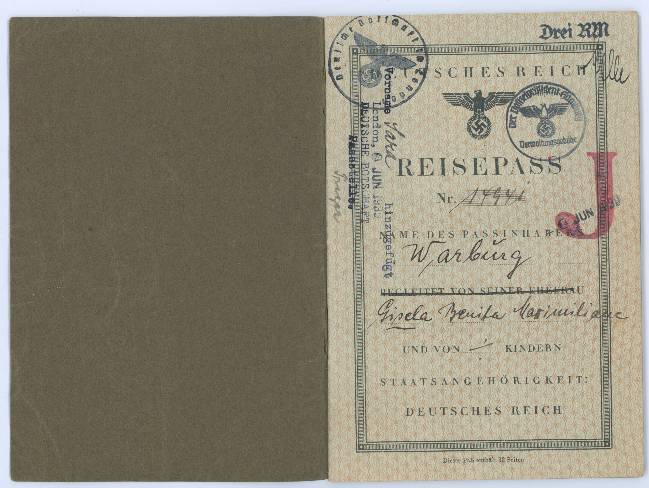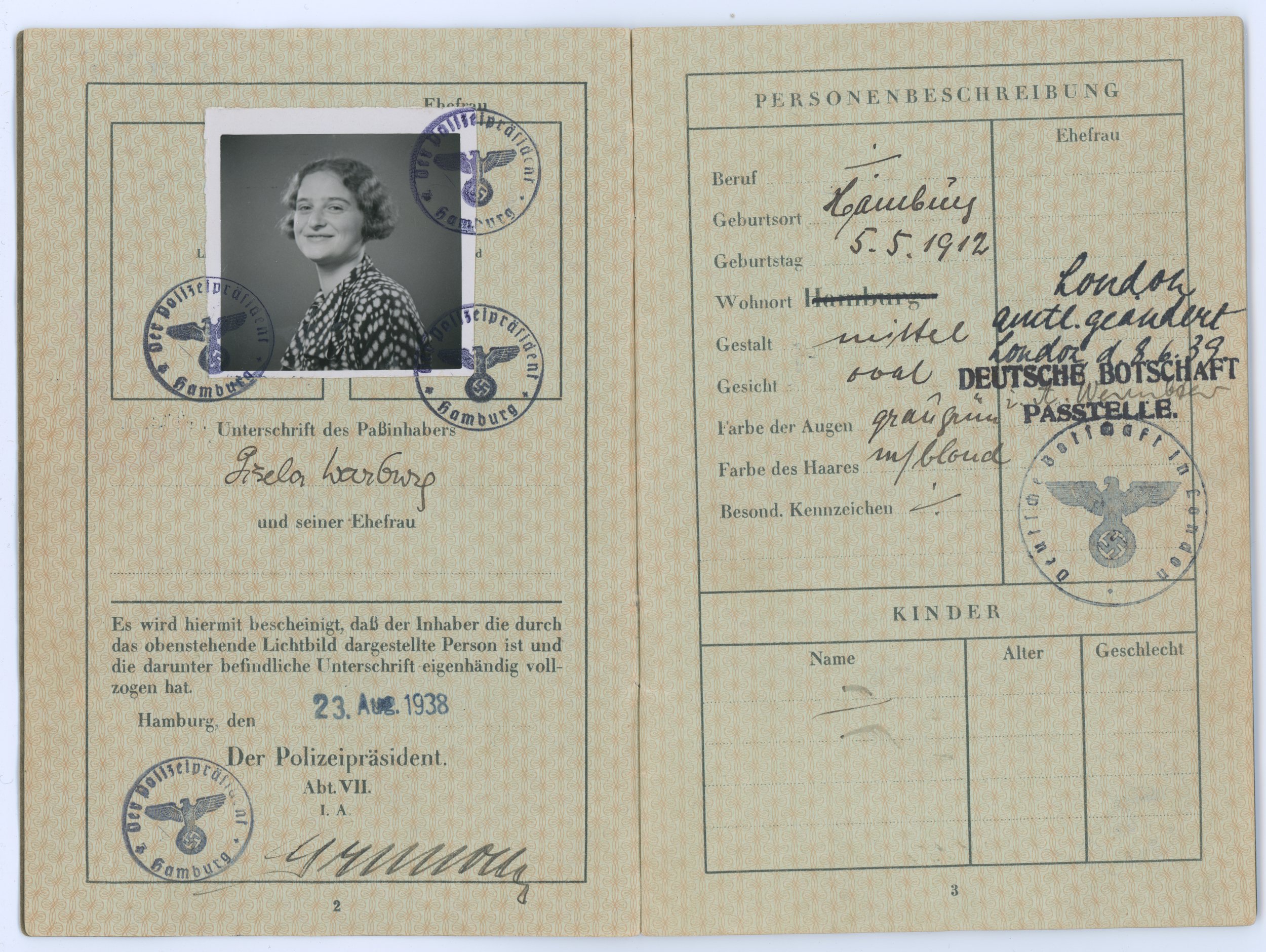 Gisela’s Reisepass (German passport), received Aug 23, 1938.