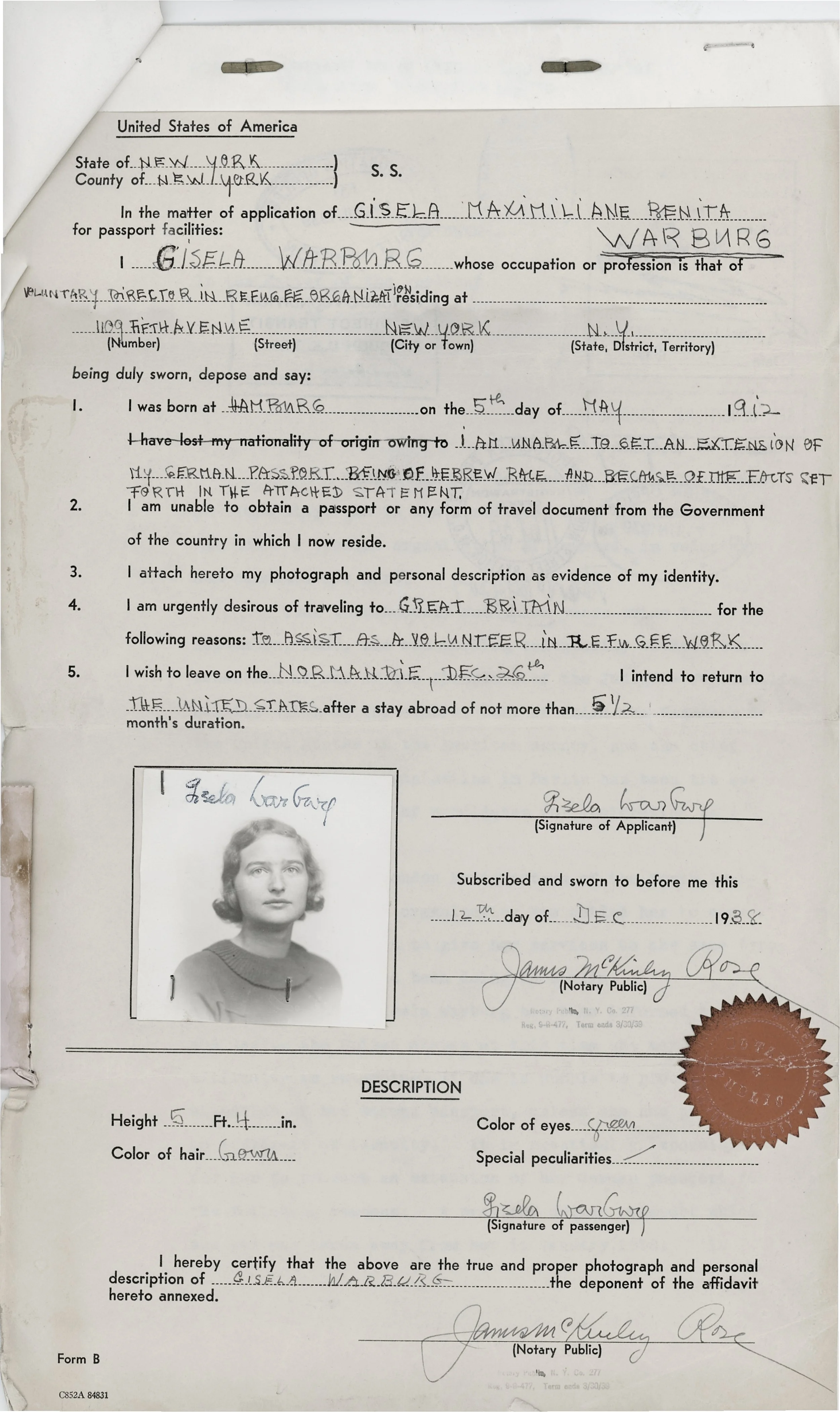 Gisela’s US Passport application, filed on December 12, 1938.