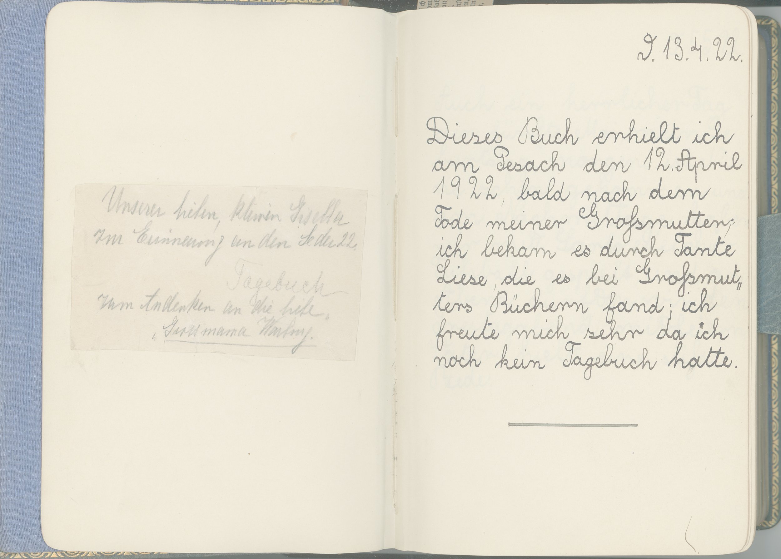 The first page of Gisela’s diary, written April 13, 1922.